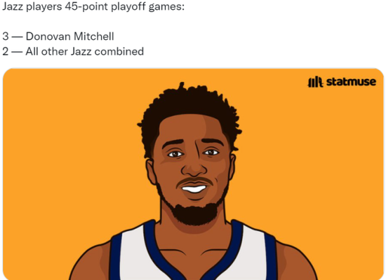 在爵士队史上的季后赛中,米切尔一人就有3次单场45+分,而其他爵士球员加起来也只有两场。因此,这一数据上,米切也是队史第一人。