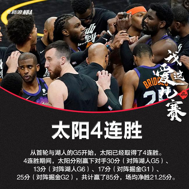 4连胜期间,太阳分别赢下对手30分(对阵湖人G5)、13分(对阵湖人G6)、17分(对阵掘金G1)、25分(对阵掘金G2),共计赢了对手85分,场均净胜21.25分。