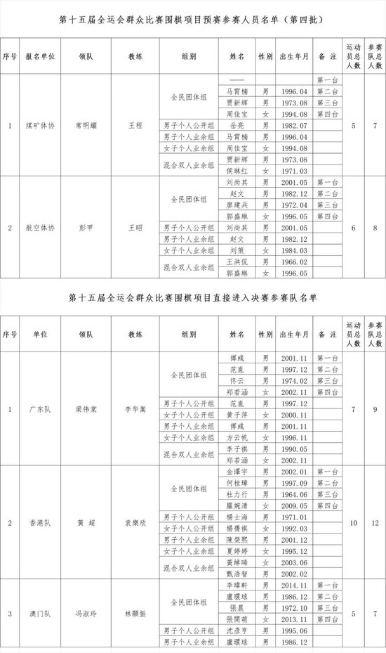 中华人民共和国第十五届运动会群众比赛围棋项目预赛 参赛人员名单(第四批)、直接进入决赛参赛队名单公示 各有关单位: 第十五届全运会群众比赛围棋项目预赛分别定于9月6日至9月11日、9月11日至9月16日在上海市奉贤区和浙江省衢州市举行。根据