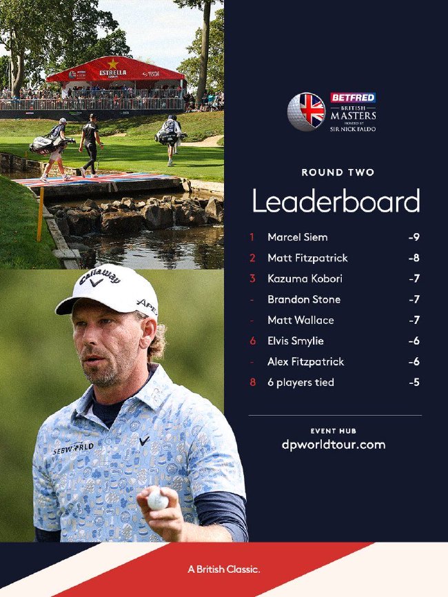 北京时间8月23日,英国大师赛,德国45岁老将马塞尔-西姆继首轮打出66杆后,周五再交69杆,两轮135杆,低于标准杆9杆,独占鳌头,带着一杆优势进入周末决赛。 西姆从10号洞开启次轮征程,开局势如破竹:前8洞狂擒一鹰三鸟,其中更连续在15、1
