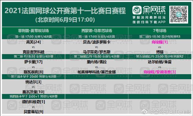 6月9日,法网进入第11比赛日,纳达尔迎战施瓦茨曼、斯瓦泰克对阵萨卡里。