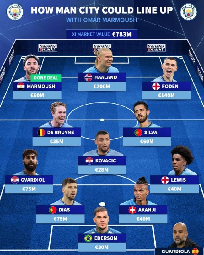 埃及前锋马尔穆什正式加盟英超劲旅曼城,权威数据平台《转会市场》预测了曼城的潜在主力阵容。 德转给出的曼城当前潜在主力阵容总身价达7.83亿欧元,括号内为球员身价。 前锋线上,有刚加盟的马尔穆什(6000万),搭档哈兰德(2亿)、福登(1.4亿