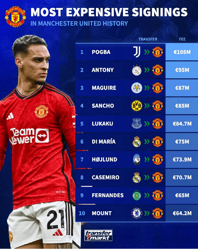 曼联队史引援价最高十位球员 博格巴1.05亿居榜首 北京时间1月24日,德转统计了曼联队史引援身价最高的十位球员: 排名第一的是博格巴,转会身价为1.05亿欧。 2、安东尼,9500万欧 3、马奎尔,8700万欧 4、桑乔,8500万欧
