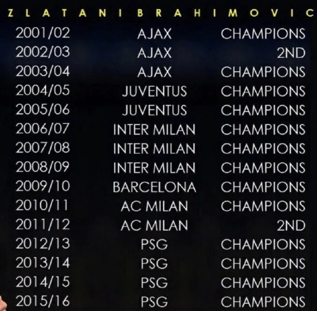 伊布社交媒体秀冠军数量 15个赛季拿13个联赛冠军 北京时间1月24日,伊布在社交媒体上秀出自己的联赛冠军数量。从2001/02赛季至2015/16赛季,伊布在15个赛季中,只有2次没有拿到联赛冠军。 伊布附文:“16年,只有2次失败。剩下的