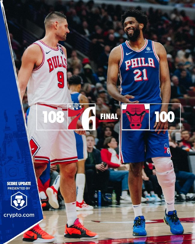 北京时间12月9日,NBA常规赛,以下是两场比赛的综述。 76人108-100力克公牛 76人(7-15):恩比德31分12篮板4助攻、马克西25分11篮板14助攻、乔治12分7篮板、乌布雷12分10篮板、麦凯恩11分4助攻 公牛(10-1