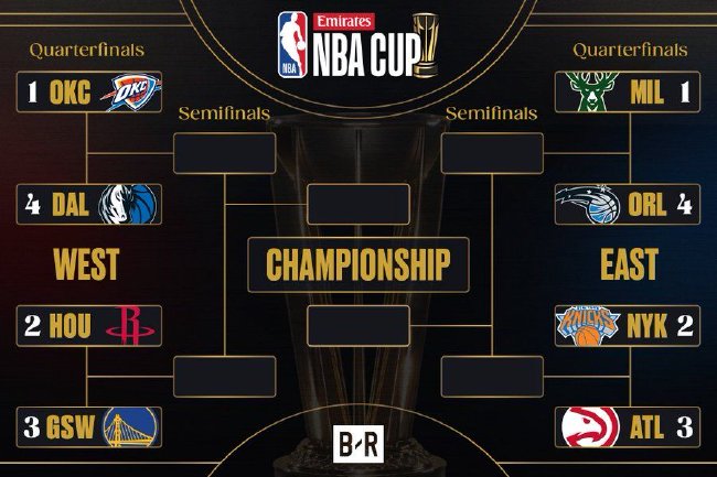 北京时间12月4日,NBA杯赛小组赛全部结束,淘汰赛赛程出炉。 西部晋级的四支队伍分别为:雷霆(1)、火箭(2)、勇士(3)和独行侠(4)。 淘汰赛的对阵为:雷霆VS独行侠、火箭VS勇士。 东部晋级的四支队伍分别为:雄鹿(1)、尼克斯(2)