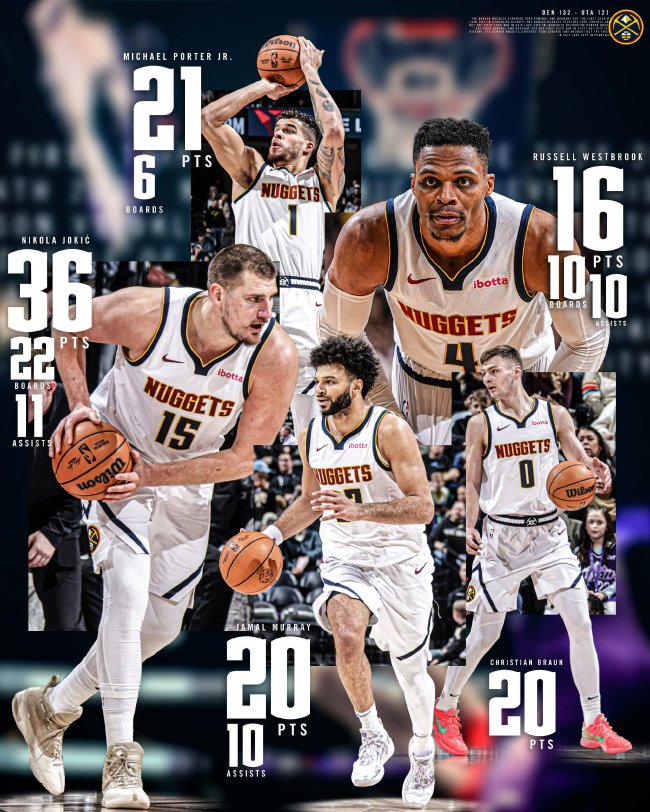 北京时间12月31日,NBA常规赛,以下是两场比赛的综述。 掘金132-121力克爵士 掘金(18-13):约基奇36分22篮板11助攻4抢断、威少16分10篮板10助攻4抢断、小波特21分6篮板、穆雷20分4篮板10助攻、布劳恩20分3抢断