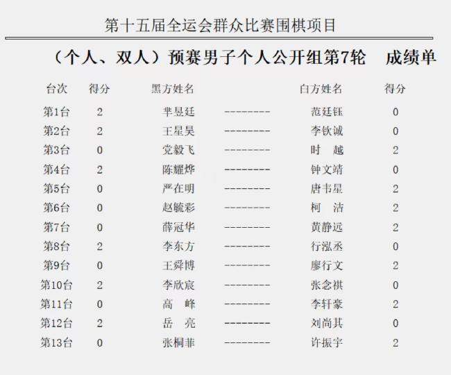9月10日,中华人民共和国第十五届运动会群众比赛围棋项目(个人、双人)预赛第7轮在上海市奉贤区大船酒店战罢,下午14:30将进行第八轮的比赛。第八轮焦点对阵包括:,时越VS芈昱廷、王星昊VS陈耀烨等。 第七轮赛果如下: 第八轮对阵如下: 预