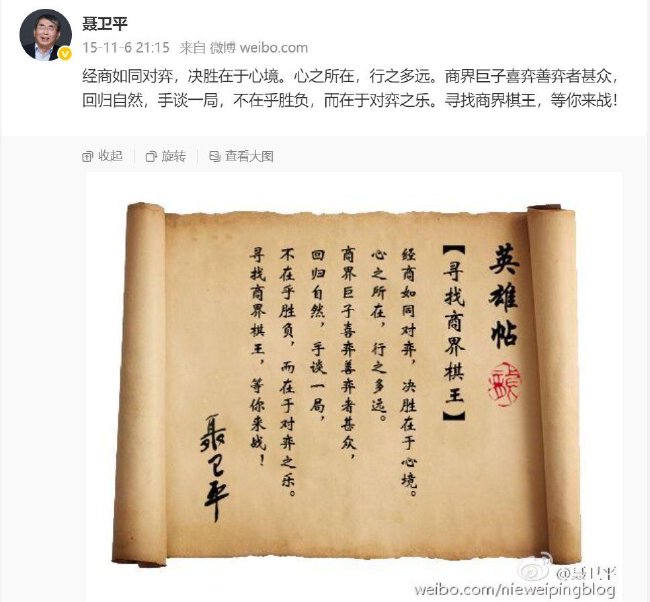 2015年聂卫平发布英雄帖 2015年随着聂卫平微博一张“英雄帖”的发布,商界棋王系列活动正式启动。十年来,五届比赛,五届巅峰对决,从北京到台北,从昆明到曼谷,近百位商界围棋翘楚参与其中。今年恰逢赛事的第十年,第六届比赛也正如火如荼地进行。我们
