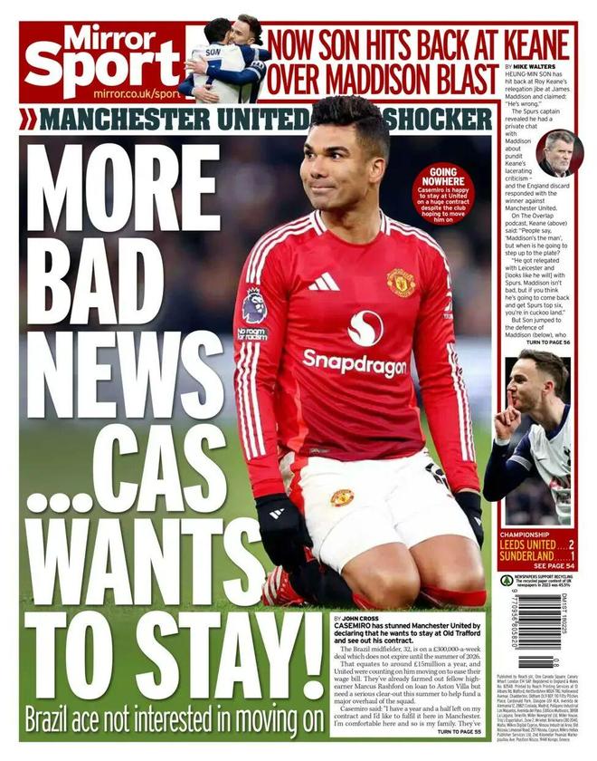 卡塞米罗明年夏天合同即将到期,相信他肯定会离开,除非曼联激活他的35万英镑周薪合同里一个赛季的优先续约条款,但吉姆·拉特克里夫爵士基本不可能这么做,他还没收购俱乐部时就炮轰这笔引援是花傻钱。