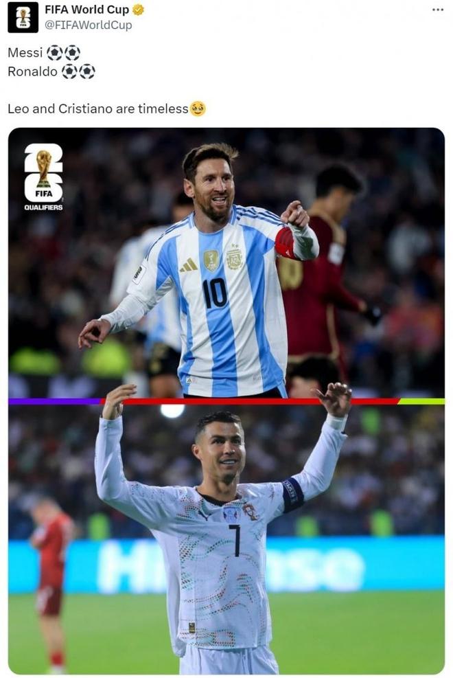 C 罗的表现也得到了足坛内外的一致认可。世界杯官方特意更新社媒,晒出梅西与 C 罗的拼接照片 —— 本轮世预赛两人均完成梅开二度,官方配文 “莱奥和克里斯蒂亚诺是永恒的”,将 C 罗与梅西并列为足坛 “永恒” 的象征,这无疑是行业对其地位的高度肯定。